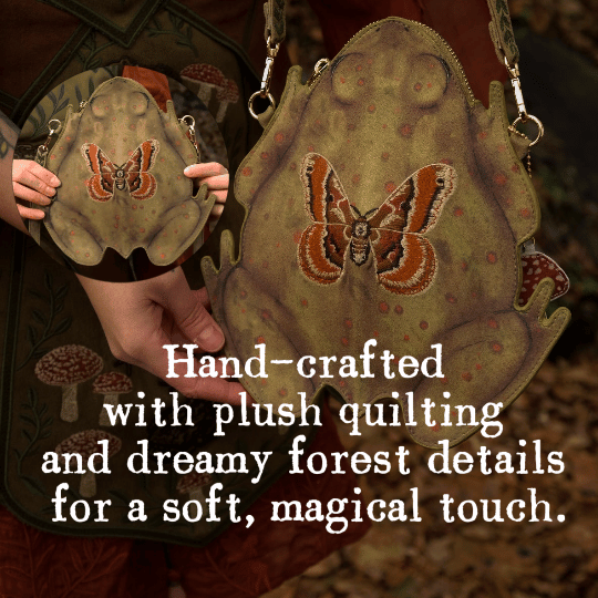 Step into the world of folklore and forest magic with this Moss Fae–inspired Toad Bag. Crafted in a charming toad silhouette and adorned with original artwork, it’s the perfect accessory for anyone who loves nature, fantasy, and a touch of mischief. Whether you're wandering through a festival, exploring a forest path, or simply elevating your everyday style, this little bog spirit is ready to hop along with you. 🍄🐸💫